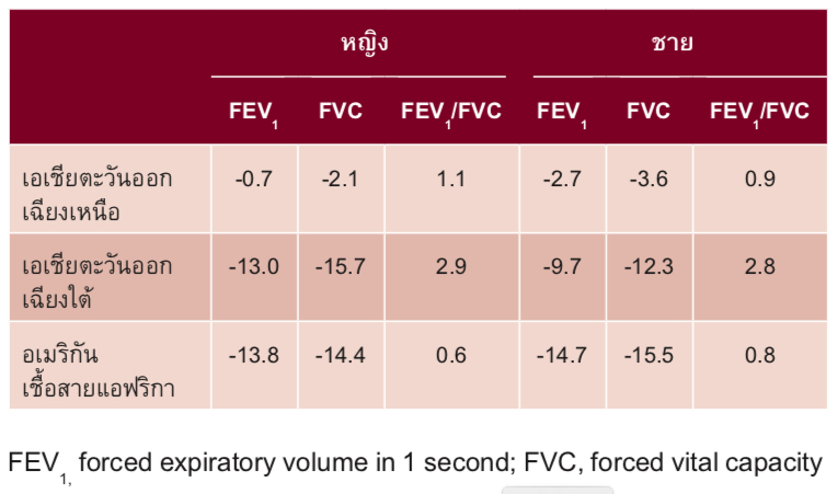 ตารางที่ 1. ความแตกต่างของค่าเฉลี่ยของสมรรถภาพปอด แยกตามเพศและชาติพันธุ์เทียบกับคอเคเซียน (ดัดแปลงจาก Quanjer PH, Stanojevic S, Cole TJ, et al. Multi-ethnic reference values for spirometry for the 3-95-yr age range: the global lung function 2012 equations. 2012;