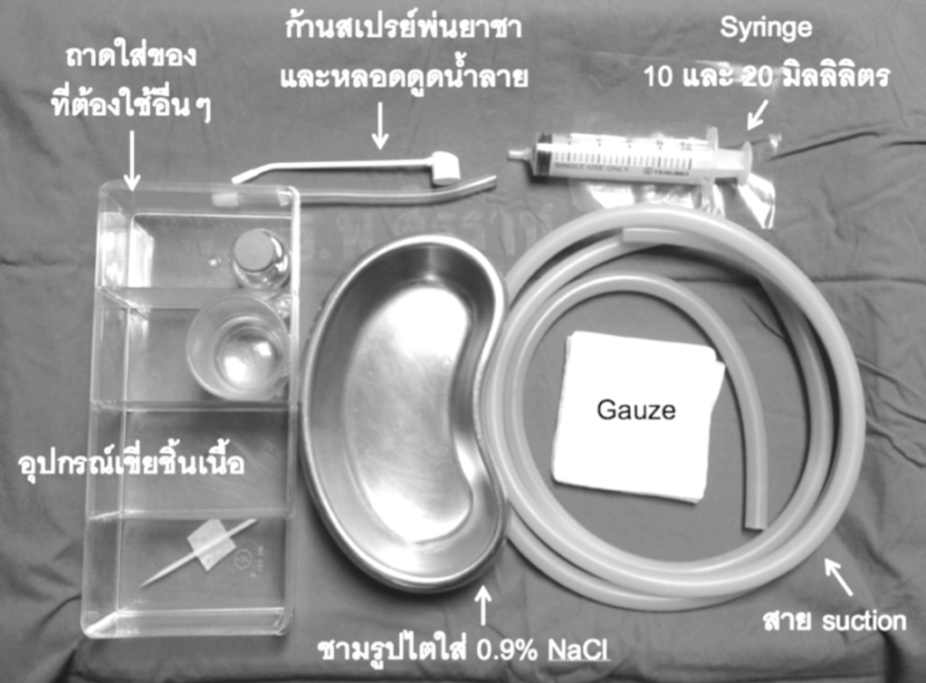 การเตรียมอุปกรณ์อาจแตกต่างกันไปตามสถาบันและหัตถการที่จะทําร่วมด้วย ควรมีการจัดเตรียมอุปกรณ์ที่จะใช้ให้พร้อม โดยเป็นอุปกรณ์ที่สะอาดปราศจากเชื้อและทดสอบให้ใช้งานได้ดีเสมอ (รูปที่ 3)