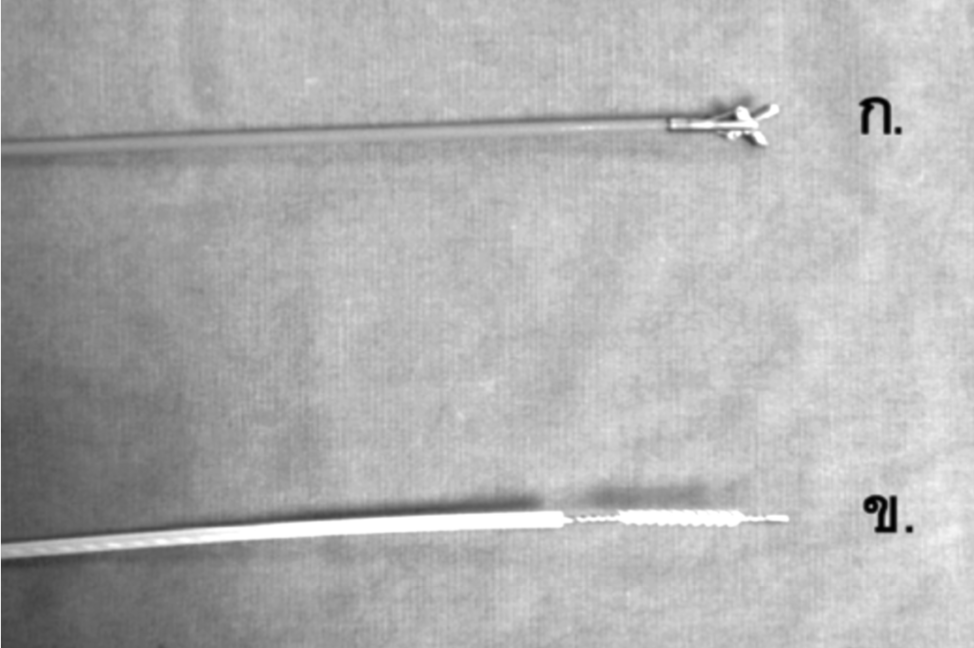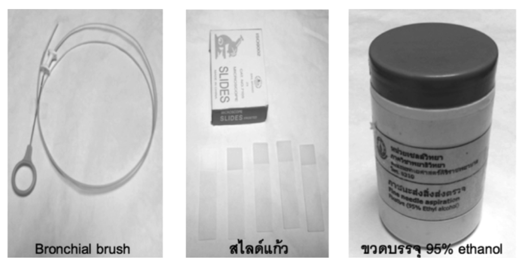 - อุปกรณ์การเก็บสิ่งส่งตรวจจาก bronchial brush (รูปที่ 7) การเก็บสิ่งส่งตรวจจาก bronchial brush นั้นขึ้นอยู่กับแพทย์และสถาบันที่ตรวจ โรงพยาบาลศิริราชส่งตรวจเซลล์วิทยาด้วยการป้ายสิ่งส่งตรวจลงบนสไลด์ โดยใช้อุปกรณ์ดังนี้