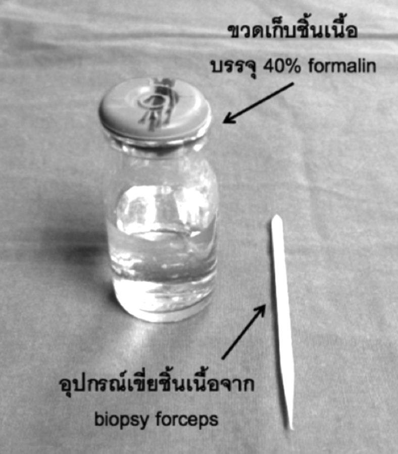 - เมื่อเก็บชิ้นเนื้อครบแล้ว ปิดฝาขวดให้สนิทและติดป้ายชื่อให้เรียบร้อย โดยตรวจสอบให้ตัวหนังสือชัดเจนและชื่อตรงกับผู้ป่วย