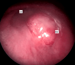 ผู้ป่วยได้รับการส่องกล้องหลอดลมชนิดแข็ง (rigid bronchoscopy) ร่วมกับการทำ tumor removal โดยวิธี multimodality techniques ได้แก่ Nd-YAG laser เพื่อ devitalized tissue และป้องกันการเกิดเลือดออก, forceps debulking และ mechanical coring out หลังจากการทำหัตถการสามารถเปิด right main bronchus ได้ แต่ยังมี residual tumor ที่ posterior wall ของ right main bronchus ดังแสดงในรูปที่ 4 ผลการตรวจทางพยาธิวิทยาพบเป็น benign nerve sheath tumor favor schwannoma (positive for S100, SOX10 และ vimentin และ negative for HMB 45, melan A, AE1/AE3, CD56 และ EMA)
