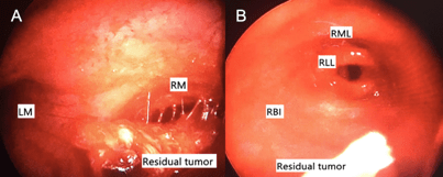 รูปที่ 4 ภายหลังการทำ tumor removal; A, Residual tumor ที่ posterior wall ของ right main bronchus และพบมี carinal involvement; B, Right bronchus intermedia ไม่พบ tumor involvement; LM, left main bronchus; RM, right main bronchus; RBI, right bronchus intermedia; RML, right middle lobe; RLL, right lower lobe.
