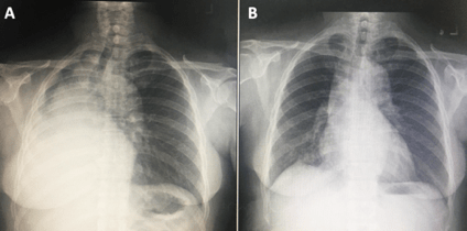 ภายหลังการทำหัตถการ อาการผู้ป่วยดีขึ้นทันที ภาพถ่ายรังสีทรวงอกดีขึ้นดังแสดงในรูปที่ 5 และได้ส่งปรึกษาแพทย์ศัลยกรรมทรวงอกเพื่อประเมินการรักษาโดยการผ่าตัด แต่พบว่ารอยโรคมีความเสี่ยงในการผ่าตัดสูง จึงพิจารณาติดตามอาการและให้การรักษาเฉพาะที่โดยการทำ rigid bronchoscopy ร่วมกับ tumor removal กรณีที่ก้อนมีขนาดใหญ่ขึ้น