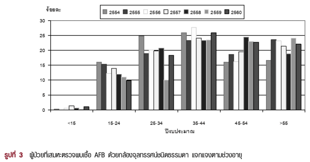 เมื่อพิจารณาอายุ พบว่า ผู้ป่วยที่เสมหะตรวจพบเชื้อ AFB มีอายุเฉลี่ย 43.99 (± 15.93) ปี โดยในปีงบประมาณ 2556 ผู้ป่วยมีอายุต่ำสุดคือ 3 เดือน ส่วนในปีงบประมาณ 2560 ผู้ป่วยมีอายุสูงสุดคือ 98 ปี (ตารางที่ 2)