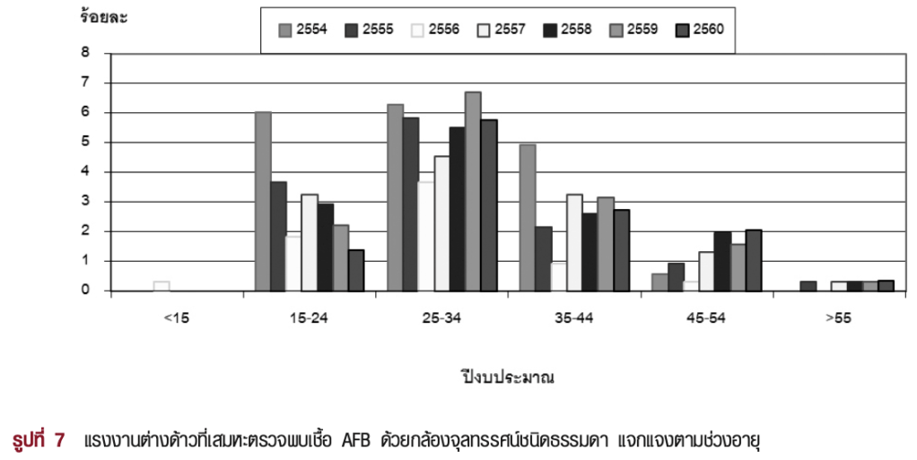 เมื่อพิจารณาตามช่วงอายุ พบว่า ผู้ป่วยส่วนใหญ่อยู่ในช่วงอายุระหว่าง 25-44 ปี ซึ่งเป็นช่วงอายุในวัยทำงาน ที่ผ่านมาผู้ป่วยกลุ่มนี้จะสัมพันธ์กับการติดเชื้อ HIV ซึ่งในการศึกษานี้ไม่ได้วิเคราะห์ข้อมูลด้วย อีกทั้งยังเป็นกลุ่มที่มีบทบาทสำคัญในการพัฒนาเศรษฐกิจของประเทศ เป็นกำลังสำคัญของครอบครัวและเป็นที่พึ่งของคนในครอบครัว ปัจจุบันประเทศไทยมีการเปลี่ยนแปลงโครงสร้างประชากรของประเทศที่มีผู้สูงอายุเพิ่มมากขึ้น และมีการเจริญเติบโตทางด้านเศรษฐกิจ ทำให้ส่งผลกระทบโดยตรงจากภาคอุตสาหกรรมการผลิต จึงทำให้มีความต้องการแรงงานวัยหนุ่มสาวเพิ่มมากขึ้น แรงงานวัยหนุ่มสาวจากประเทศเพื่อนบ้านจึงอพยพเคลื่อนย้าย อีกทั้งนโยบายการเปิดประชาคมเขตเศรษฐกิจอาเซียนซึ่งปัจจัยสำคัญที่เอื้อให้มีการเคลื่อนย้ายแรงงานได้อย่างเสรีมากขึ้น ทั้งนี้อุบัติการณ์วัณโรคของประเทศเพื่อนบ้านสูงกว่าประเทศไทย 2-3 เท่า 9 อย่างไรก็ตาม ผู้ป่วยส่วนใหญ่ก็ยังเป็นคนไทย