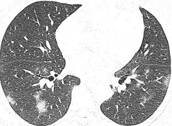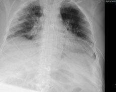 พบความผิดปกติจากภาพถ่ายรังสีทรวงอกในวันแรกที่รับไว้ในโรงพยาบาล 66% โดยส่วนใหญ่ที่พบเป็น bilateral peripheral opacities/consolidations (รูปที่ 1) มีส่วนน้อยที่เป็น unilateral involvement (รูปที่ 2) บางรายพบลักษณะของ focal opacities ทำให้ดูคล้ายเป็น nodule หรือ mass (รูปที่ 3) และพบ pleural effusion (รูปที่ 4) เพียง 3 รายเท่านั้น ได้ทำการตรวจ CT scan ไป 4 ราย ซึ่งพบว่ามีความไวในการตรวจพบความผิดปกติได้เพิ่มขึ้น
