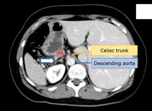 - Abdominal aorta and celiac trunk identification: จากตำแหน่งของ left lobe liver หมุนกล้องตามเข็มนาฬิกาถึงบริเวณ 6 นาฬิกา จนพบกับ abdominal aorta ซึ่งมีลักษณะเป็นเส้นเลือดขนาดใหญ่ทอดตามแนวยาว เห็นลักษณะการเต้นตามชีพจรชัดเจน และผนังหนา จากนั้นให้สอดกล้องลงไปตามความยาวของ abdominal aorta จนกระทั่งเห็นสาขาแรกที่แตกออกจาก abdominal aorta คือ celiac trunk