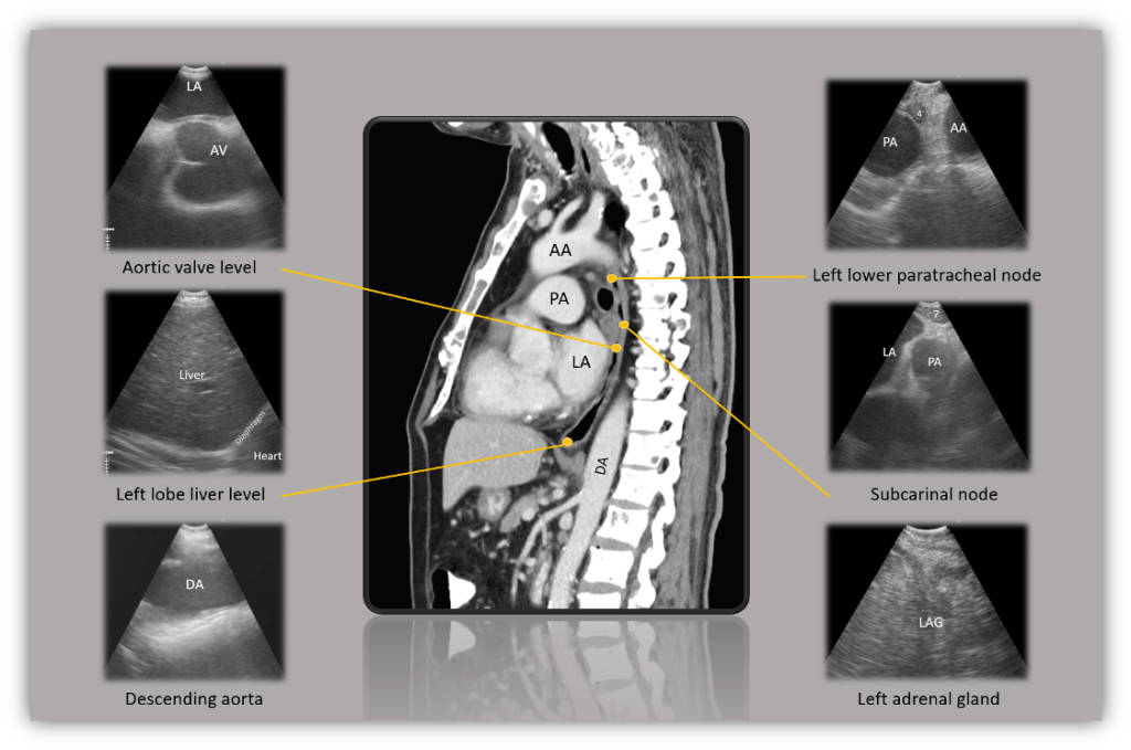 - สามารถเข้าถึงตำแหน่งของต่อมน้ำเหลืองบางตำแหน่งที่ EBUS ไม่สามารถเข้าถึงได้ด้วยเหตุผลทางกายวิภาค ได้แก่ สถานีretrotracheal (3P), sub-aortic (5), para-esophageal (8), และ pulmonary ligament node (9) รวมถึงต่อมน้ำเหลืองในช่องท้องที่ติดกับหลอดอาหารและต่อมหมวกไตซ้าย